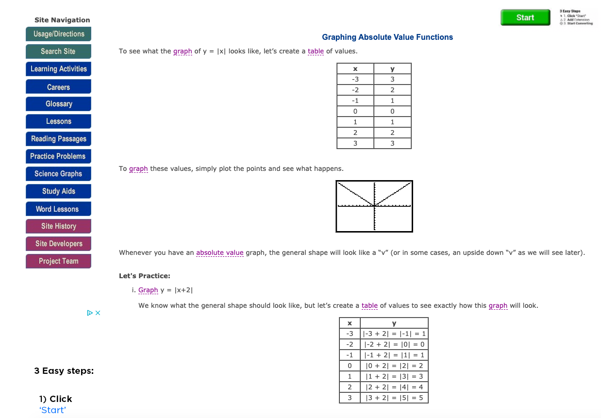 In this activity, students learn to graph Absolute Value Functions. Using a few examples, students investigate different patterns of functions. There is a short assessment where students can check their understanding of graphing absolute value functions.
