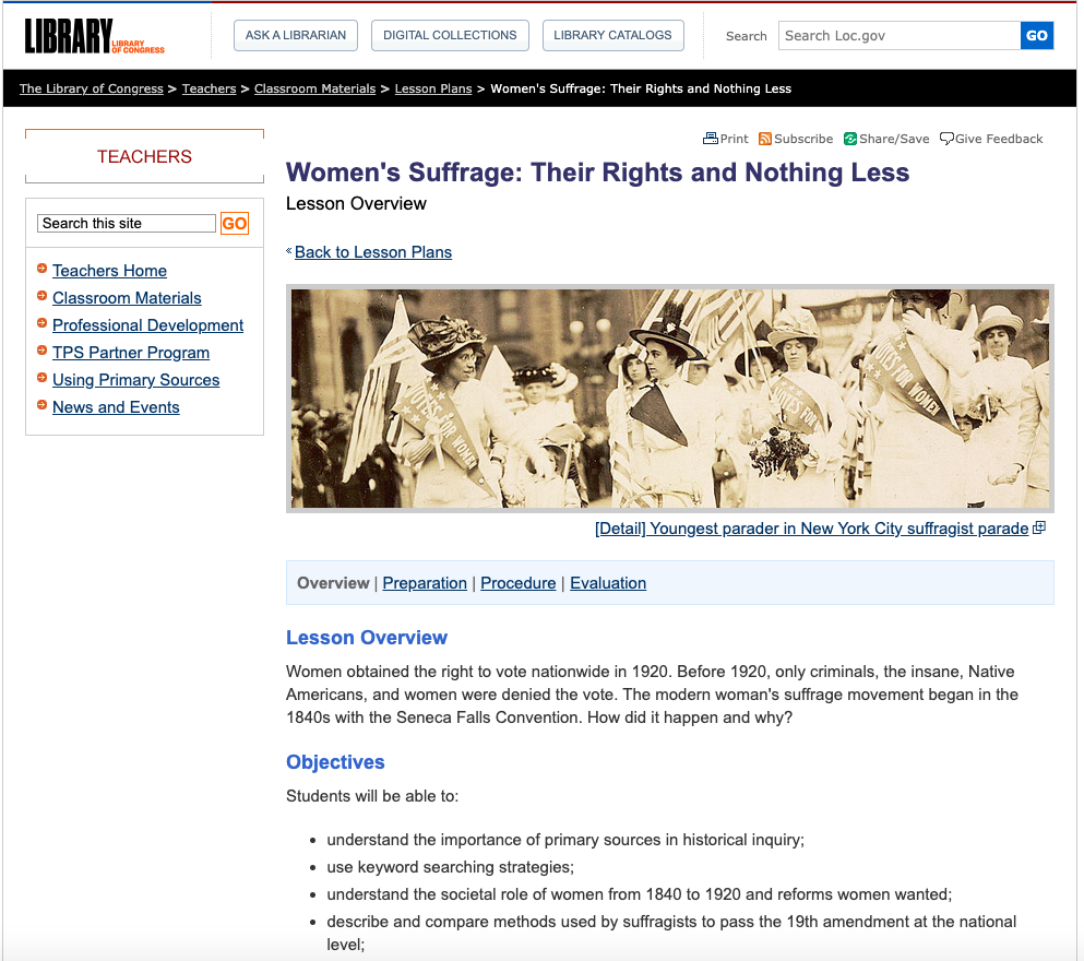 - Preview the Example Web Site link to a Women's Sufferage lesson and get familiar with the Teachers Guide (pdf) offered and the many resources available.