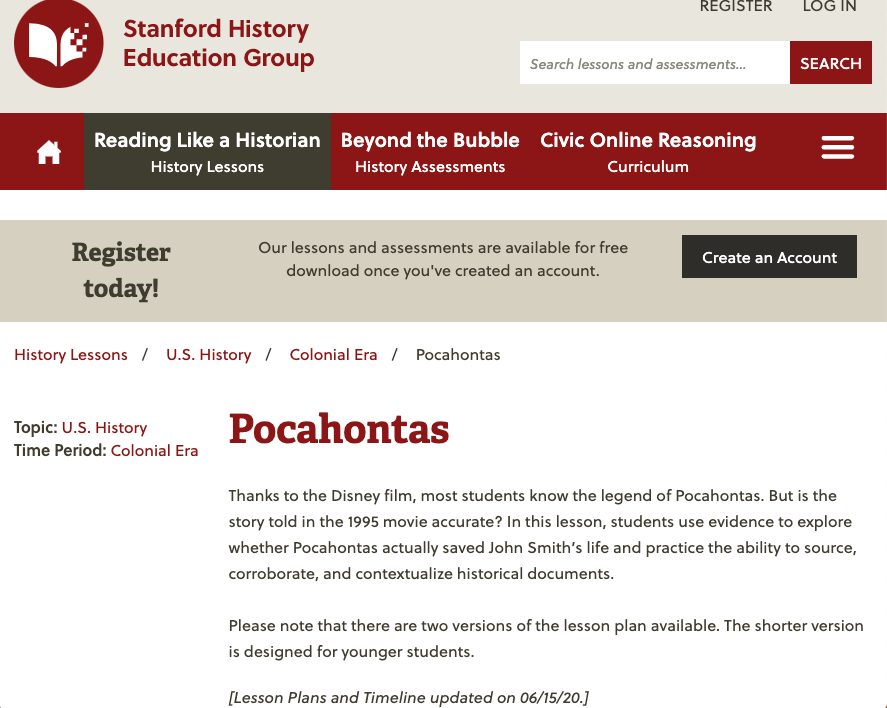Screenshot of the Reading Like a Historian lesson on Pocahontas