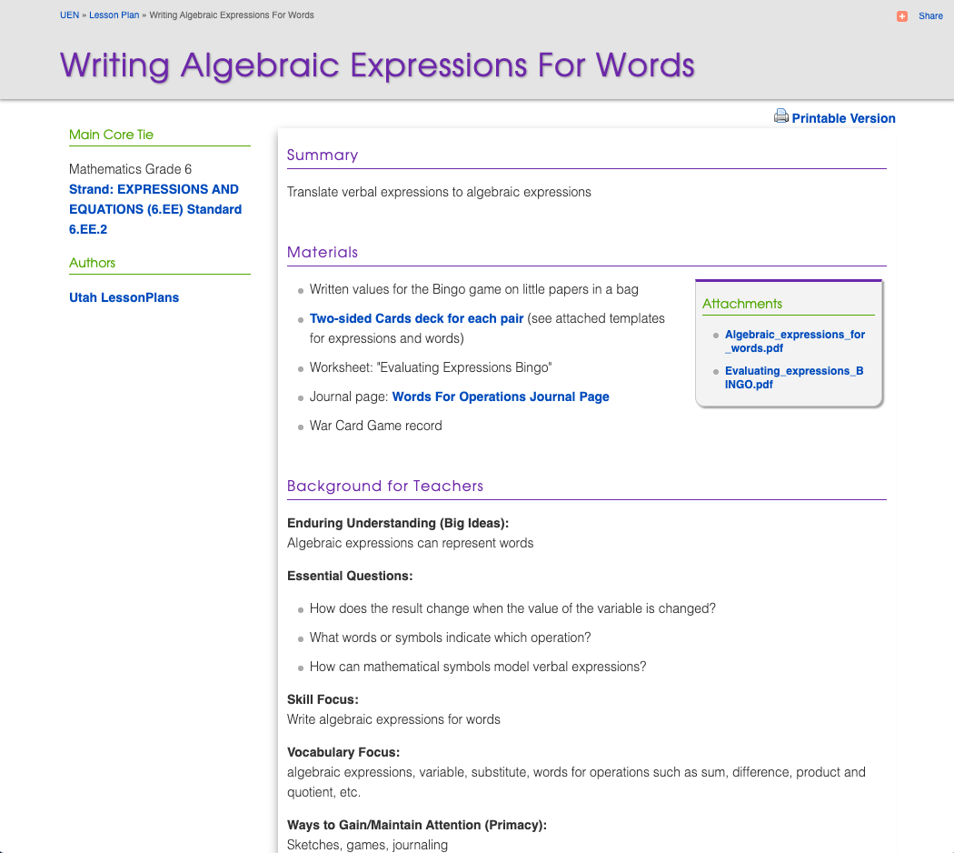 Utah Education Network - Writing Algebraic Expressions For Words